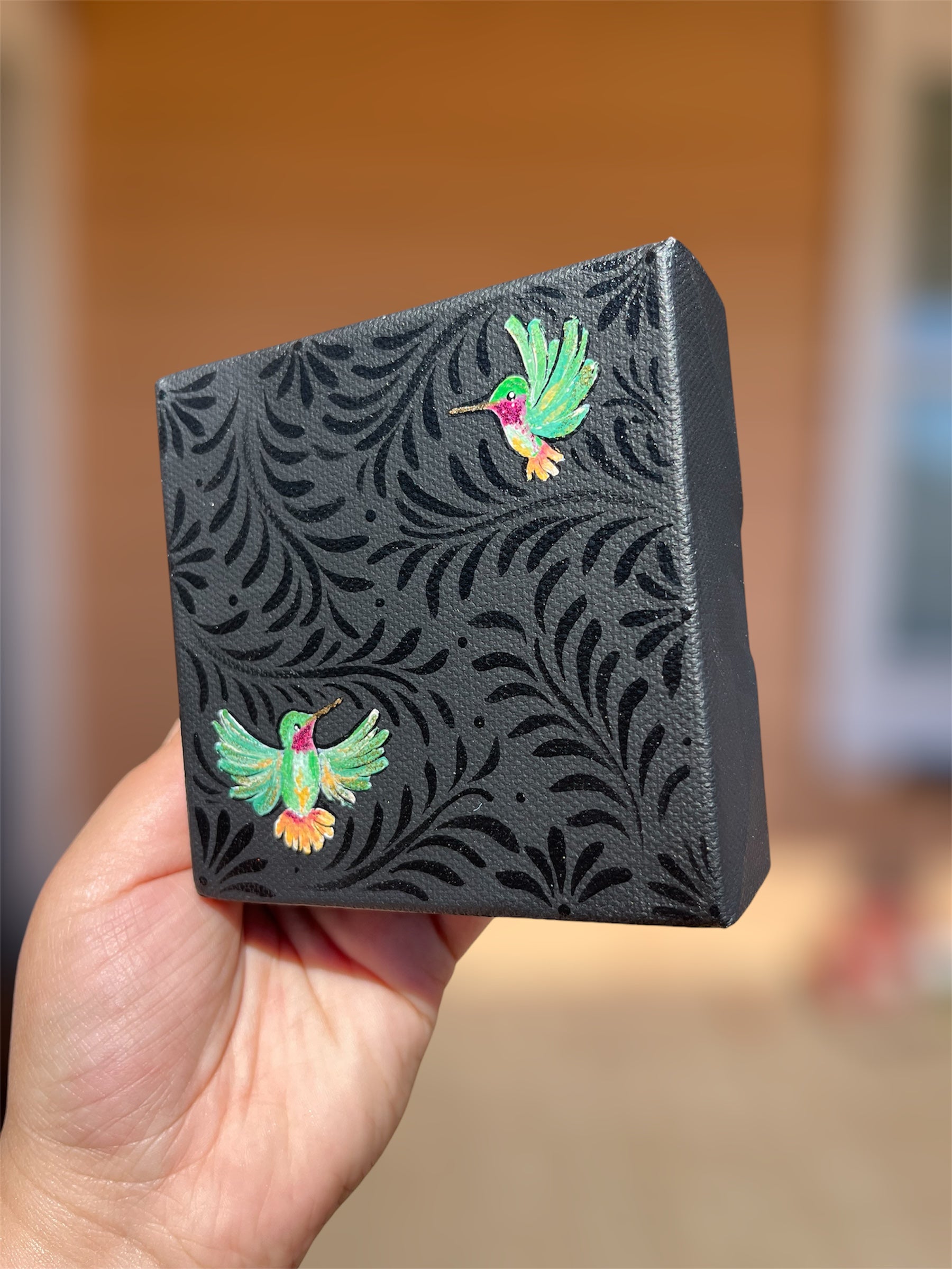 Hand painted with acrylic on 4x4in heavy duty canvases. Glitter accents. All sales final.