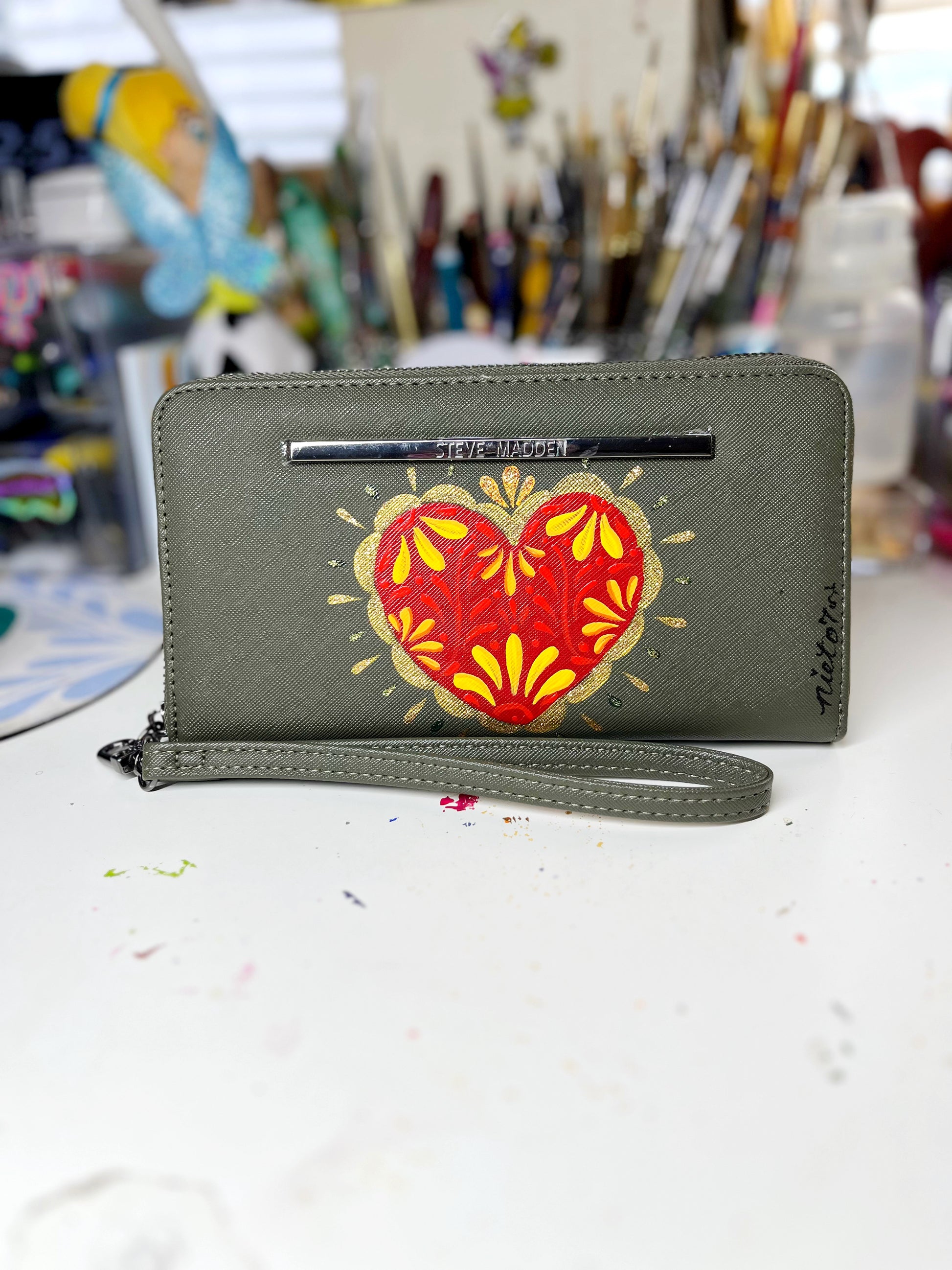 This one of a kind wallet/wristlet is painted by hand, sealed for durability, art you can wear! Slow made details con mucho corazón. Made to last beyond one season. All sales are final.
