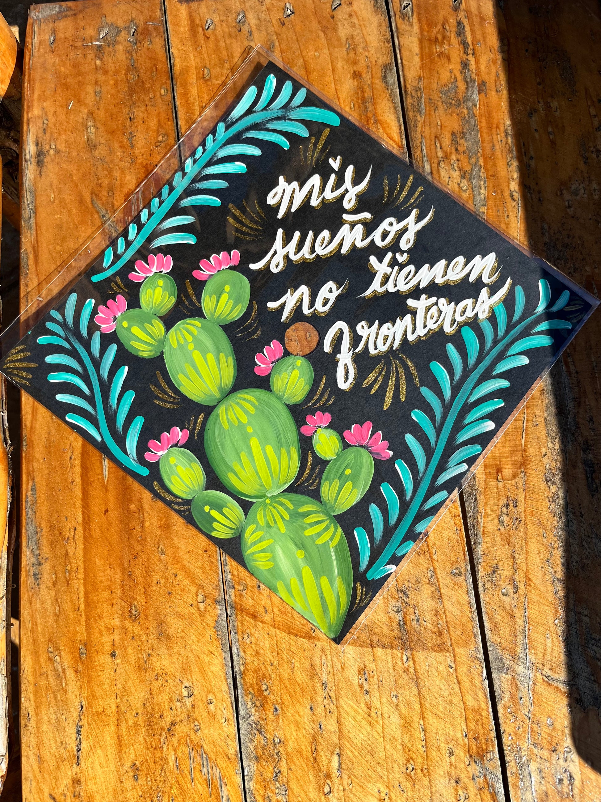 Handpainted and one of a kind on card stock. Made to fit any standard size grad cap! Double sided tape included to attach topper onto your graduation cap. Makes the perfect gift or keepsake for such a memorable day! All sales final.