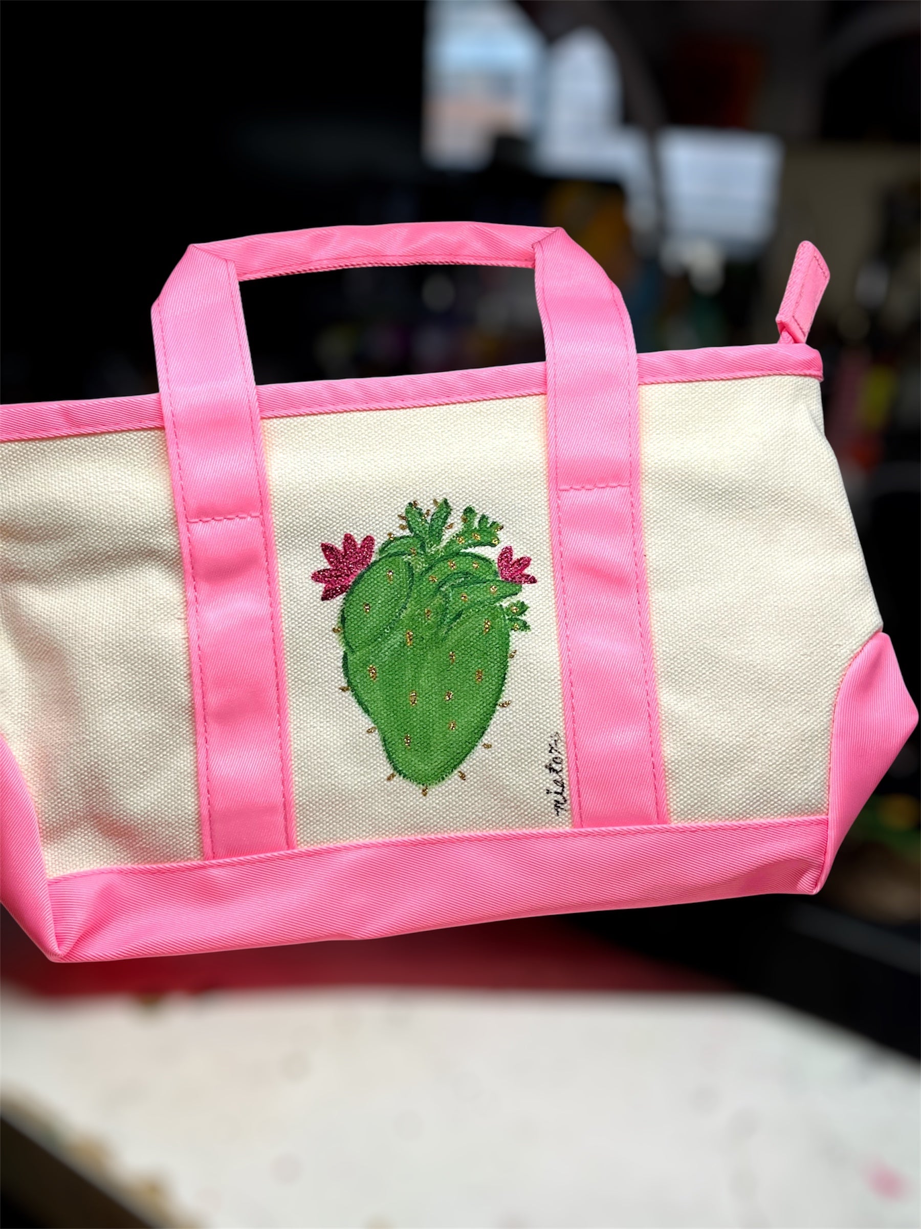 This one of a kind tote is painted by hand, sealed for durability, art you can wear! Slow made details con mucho corazón. Approx 11x7x4in. All sales are final.