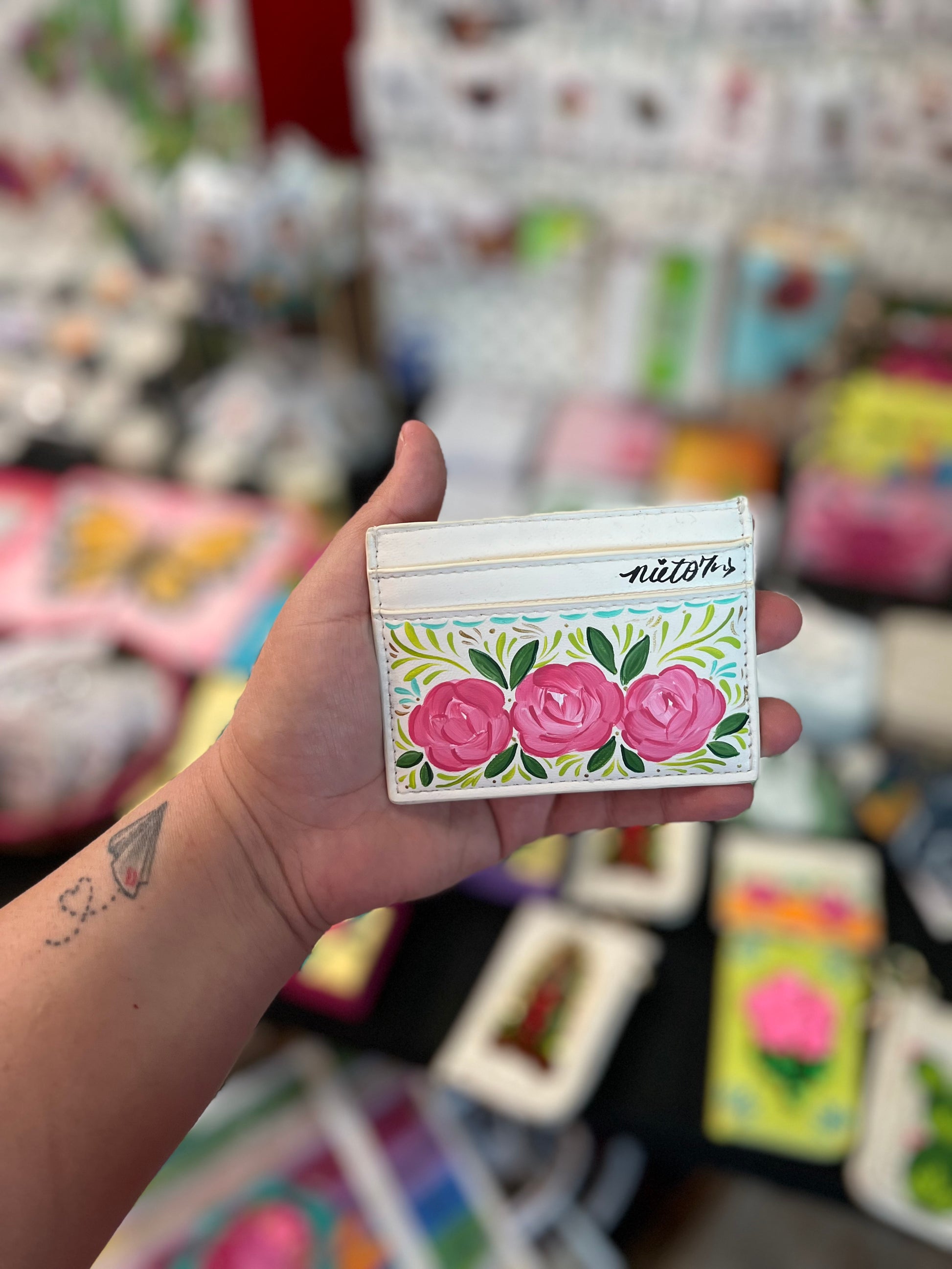 Hand painted card holder/wallet w zipper pocket. One of one. Paint has been sealed for extra protection. Signed. All sales final.